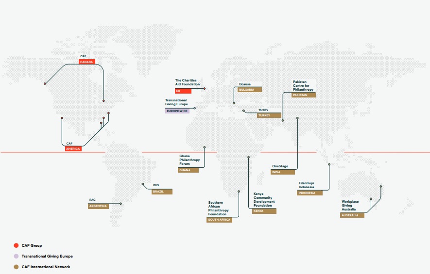 شعبه‌های اصلی این بنیاد در سه کشور آمریکا، کانادا و انگلیس مستقر هستند و همزمان با سازمان‌های مستقل خیریه در دیگر کشورها نیز همکاری می‌کنند. شرکای جهانی شبکه بنیاد CAF متخصصین کاربلدی در منطقه خود هستند و در راستای افزایش نیکوکاری در جهان مشارکت دارند. آنها این کار را از طریق ارائه راه‌حل‌های نوآورانه برای ترویج حس بشردوستی و انجام مداخلات سریع و هدفمند در جاهایی که نیازهای شدیدتری وجود دارد انجام می‌دهند.