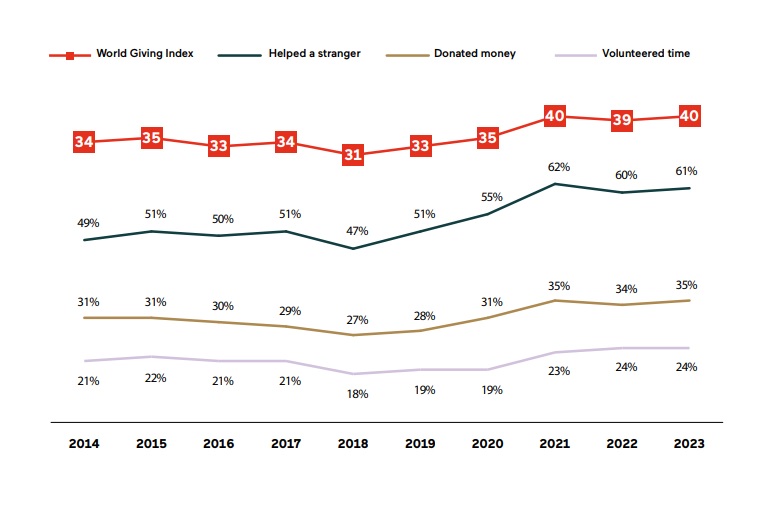 امسال نمره متوسط شاخص جهانی سخاوت 40 امتیاز است که مشابه مقدار سال 2021 است و تا کنون بالاترین امتیاز کسب شده است. در نمودار زیر می‌توانید شاخص جهانی سخاوت و درصدهای مربوط به کمک به افراد ناشناس، کمک‌های مالی و زمان‌های فعالیت‌های داوطلبانه در سال‌های 2014 تا 2023 را با هم مقایسه کنید.